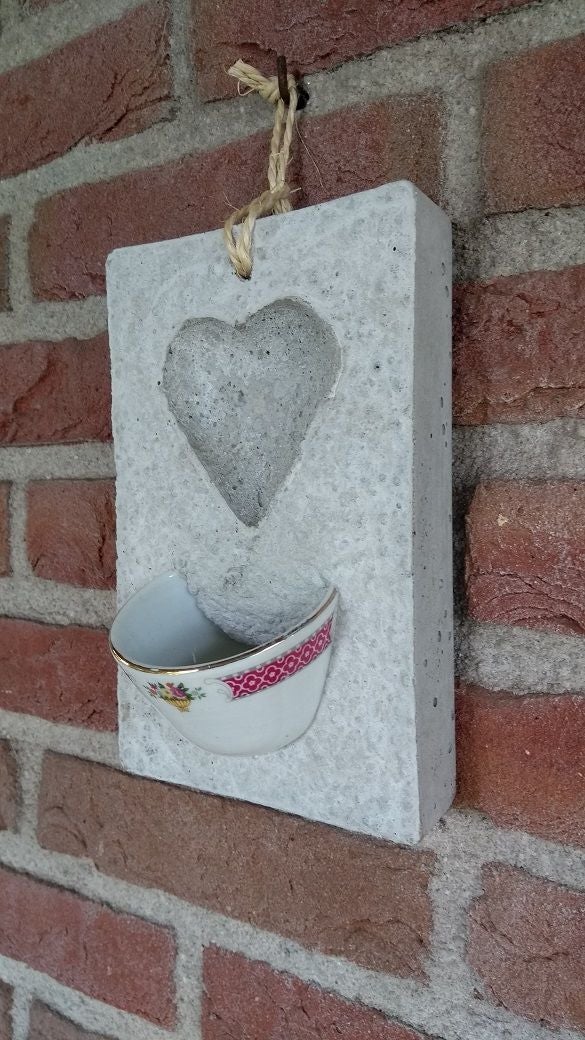 Deze grappige wandhanger is gemaakt van beton. Met een hartvormige uitsparing.