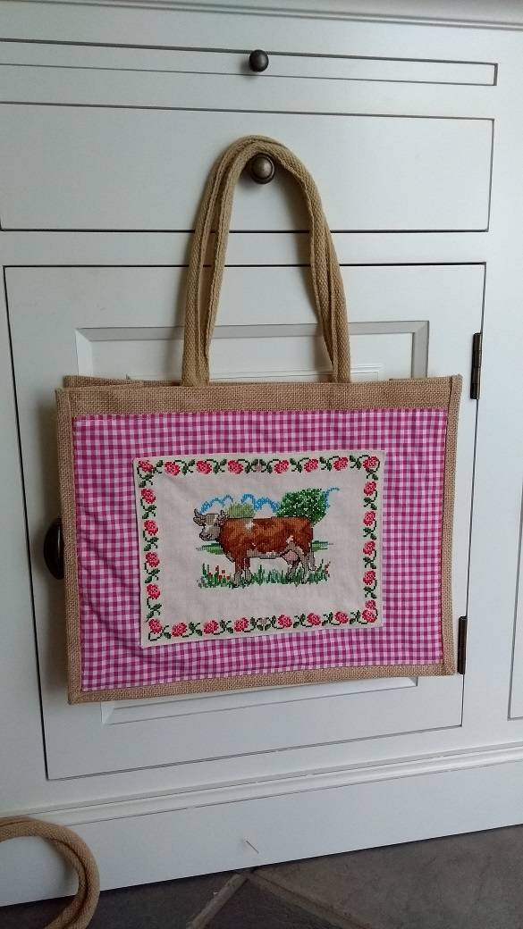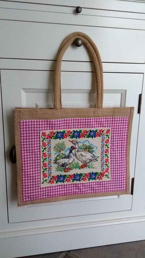 Canvas tasjes met een buitenkant van zeil. Afgewerkt met een gehaakte rand.